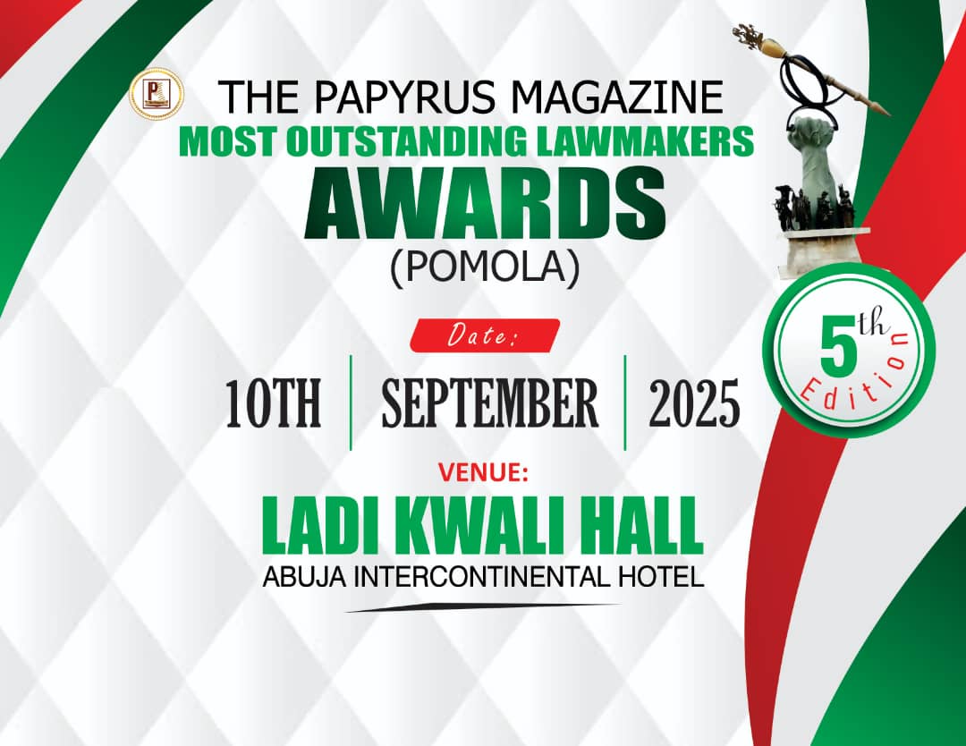 On September 10, 2025, the spotlight will shine brightly at the Ladi Kwali Hall, Sheraton Hotel, Abuja, as The Papyrus Magazine rolls out the red carpet for the 5th edition of its prestigious POMOLA Awards — Present Outstanding Members of the Legislature Award.